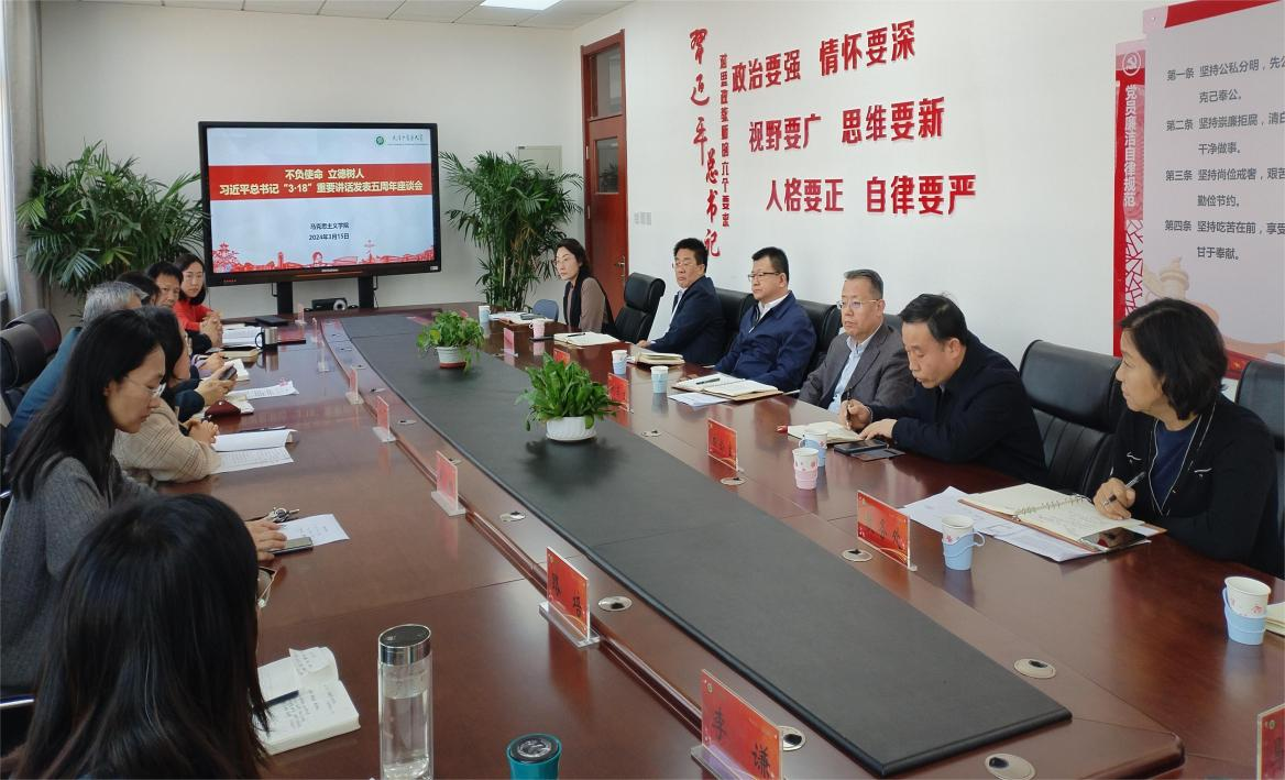 2024年是习近平总书记在学校思想政治理论课教师座谈会发表重要讲话“3·18”重要讲话五周年3月15日,学校马克思主义学院举办座谈会,重温习近平总书记“3·18”重要讲话精神。校党委书记刘革生,校党委副书记张华泉,办公室、宣传部、教务处、人事处等部门领导出席会议。马克思主义学院领导、思政课教师代表参会。马克思主义学院党总支书记郭小学主持会议。