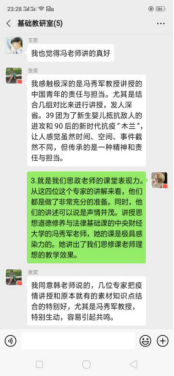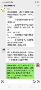 这次大思政大课不仅深化了学生对抗击疫情的认知,也拓展了老师们授课的思维宽度。课后,教师组织学生围绕讲课内容在线开展热烈地讨论、交流,更加清醒地认识到了中国抗疫彰显的中国共产党领导和中国特色社会主义制度的显著优势,进一步增强了中国特色社会主义道路自信、理论自信、制度自信、文化自信。各教研室组织教师展开了热烈讨论,研讨抗击疫情的教学内容,进行线上集体备课,大家表示要充分认识疫情防控期间讲好思政课的重要意义,将高校思想政治理论课教学优势转化为支持防疫斗争的强大力量。