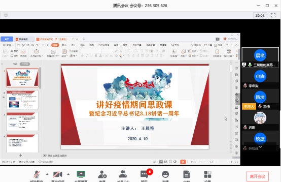 4月10日,马克思主义学院举办全体教师线上主题培训第二讲。纲要教研室主任陈宝老师和形势政策教研室主任王晨艳老师分享了疫情期间线上教学的思考和实践,陈宝老师介绍了纲要课线上教学的主旨,基本策略,通过“微课助学”的形式,让学生认识历史的生命力及对现实的价值,引导学生从历史中关照现实。