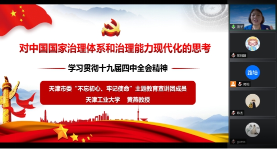 黄燕教授以《对中国国家治理体系和治理能力现代化的思考》为题,从当前全球疫情对经济发展的影响着手,深入分析了我国不断坚持和完善国家治理体系和治理能力现代化的重要意义,系统解读了十九届四中全会中关于“十三个坚持和完善”的具体要求,深刻阐述了中国特色社会主义制度的优越性,紧密结合实际情况倡导大家转变观念,为推进国家治理体系和治理能力现代化贡献力量。