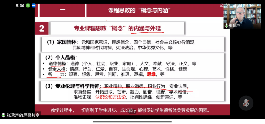 12月5日上午,马克思主义学院邀请全国优秀教师——上海中医药大学张黎声教授作课程思政线上专题讲座。党委教师工作部副部长耿晓丽、马克思主义学院领导、全体教师及“筑梦班”学员参加。会议由副院长李大凯主持。