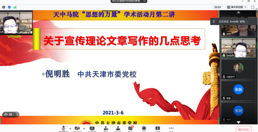 倪明胜教授长期从事执政党理论与网络政治研究,学术成果丰硕、造诣颇深,对宣传理论文章的撰写有深刻的见解与思考。倪明胜教授的讲座就是一篇以问题为导向、引规律予以支撑、举实例进行论证、讲方法授之以渔的妙品妙文。其自创的“架天线、接地气、有灵气”的写作方法是指导老师们写好理论文章的战术技巧,其阐释的“读原文原著、善思考多动笔、瞄准方向厚积而薄发”的做好学问之法是指导老师们夯实学术素养的战略指导。讲座后,多位青年教师还与倪教授进行了线上交流探讨。