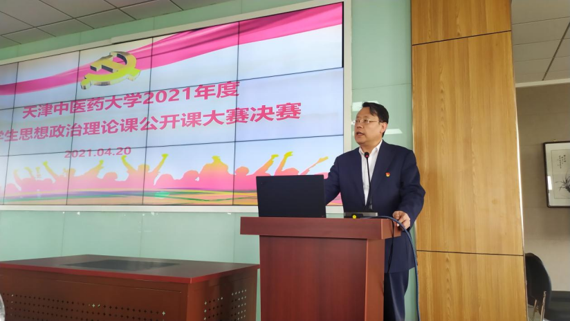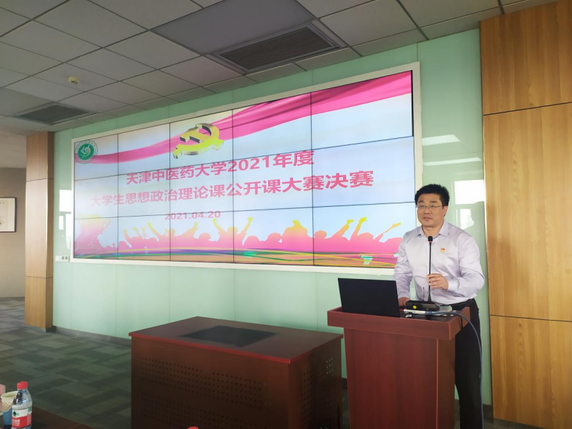 为深入学习贯彻习近平新时代中国特色社会主义思想,落实习近平总书记在学校思政课教师座谈会上重要讲话精神,聚焦“学史明理、学史增信、学史崇德、学史力行”,大力发扬红色传统,传承红色基因,激发青年学生对中国共产党百年辉煌的思想认同、政治认同、情感认同,4月20日下午,由学校主办、马克思主义学院承办、宣传部、教务处、学工部、校团委、研究生院协办的“学习百年党史、赓续红色基因、争做时代新人”2021年天津中医药大学大学生思想政治理论课公开课大赛决赛,在知行园三楼多功能厅成功举行。校党委副书记刘革生,校党委常委、宣传部部长崔强出席。协办部门和单位负责人、马克思主义学院领导、教研室主任及5名学生代表参加评审。进入决赛的13支团队和指导教师、马克思主义学院全体教师及“筑梦班”学员参加。