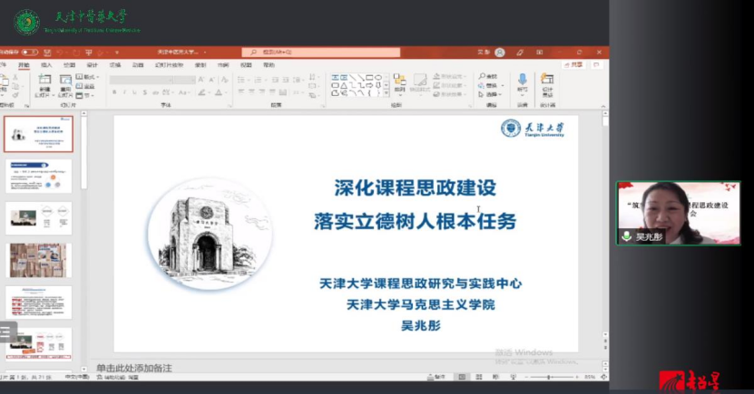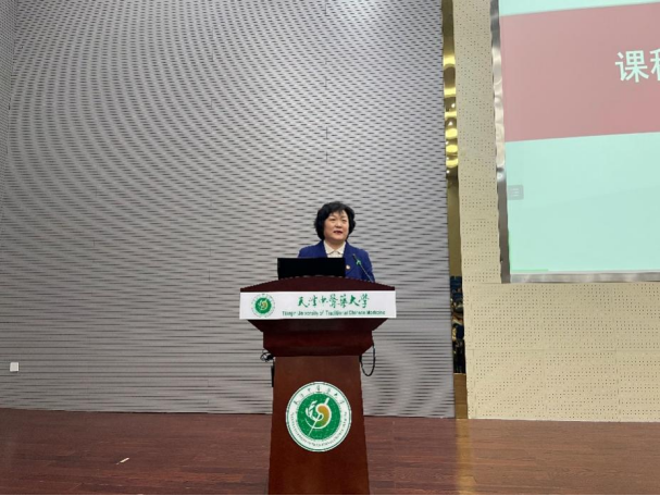 天津中医药大学教务处处长阚湘苓教授以《课程思政:从理念到实践》为题,结合习近平总书记关于课程思政的重要论述和新时代党的教育方针,从课程思政总体部署、课程思政天中落实、课程思政内涵外延三个方面做具体介绍,强调习近平总书记关于课程思政的指示精神为全面推进高校课程思政建设提供了根本遵循,勉励教师们争做为学、为事、为人的“大先生”,做好课程思政这件大事、天大的事、伟大的事。