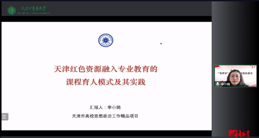 天津中医药大学“筑梦班”学员韩娟老师以《〈方剂学〉课程思政建设体会》为题,分享了自己在课程思政“筑梦班”一年来的收获与感悟。韩娟老师表示通过阅读经典、助课听课、集体备课和反复磨课,一遍又一遍地发掘和整理各学科蕴含的思政教育资源,修改教学设计,撰写教学案例,参加教学竞赛与培训,在思想政治素养、课程思政思维和课程思政教学能力方面有了长足的进步。
