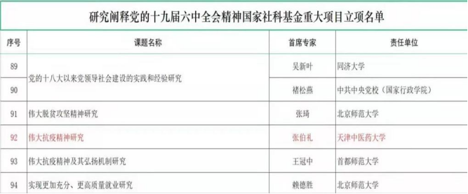 近日,全国哲学社会科学工作办公室公布了研究阐释党的十九届六中全会精神国家社科基金重大项目立项名单,我校张伯礼院士担任首席专家的项目《伟大抗疫精神研究》课题获批立项,实现学校承担国社科重大项目零的突破。