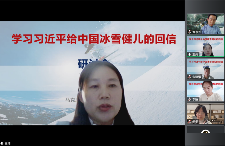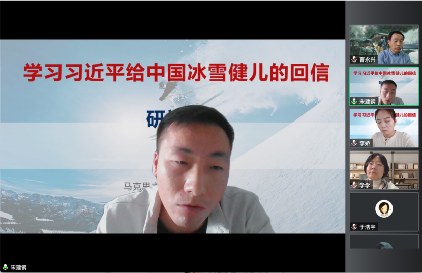 学院党总支书记曹永兴强调,作为马院思政课教师,我们要深入学习贯彻“习近平总书记给冰雪健儿的回信”,既要通过学习研讨等形式学深悟透,又要及时有效地融入思政课教学中。希望各教研室组织教师认真开展集体备课、研讨等进一步理解深化,积极探索将习近平总书记重要回信精神融入思政课教学的可行路径与有效方法,引导青年学子厚植家国情怀,增强为国争光的志气和勇气。