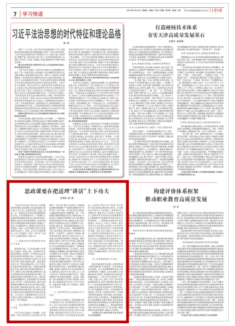 建强马克思主义学院“第一学院”、做优马克思主义学科“第一学科”、讲好思政课“第一主课”离不开对理论的研究阐释和对教学的探索实践。马克思主义学院学期伊始即启动重大宣传理论阵地发声和资政攻坚工作,组织团队进行培育。6月26日,《天津日报》刊发马克思主义学院王军杰、张振两位教师的理论文章《思政课要在把道理“讲活”上下功夫》,实现学院思政课教研模式在重大宣传理论阵地发声零的突破,展现了马院在思想政治理论课改革创新、教学科研成果培育方面的建设成效。