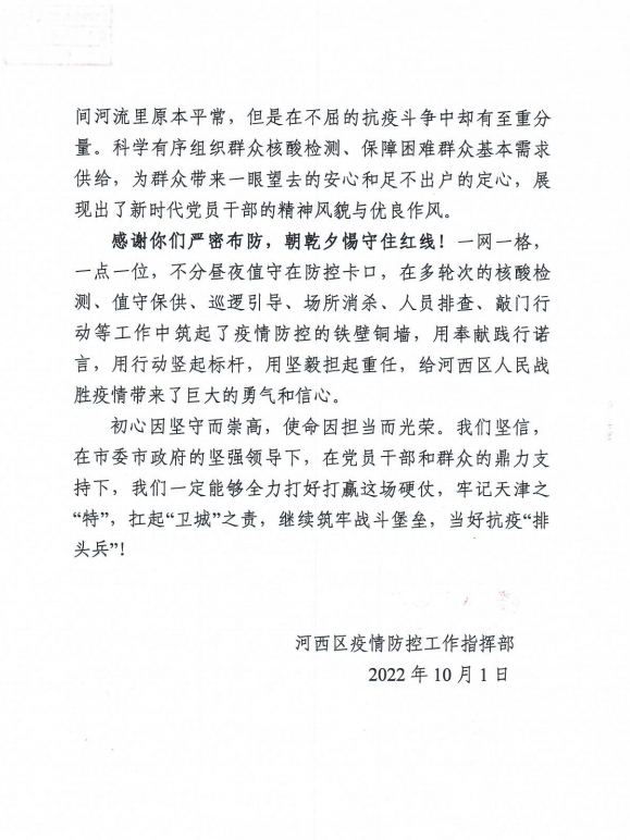 近日,学校收到河西区疫情防控工作指挥部来信,对我校支援河西区抗击新冠肺炎疫情一线的8名教职工表示感谢,我院王晨艳、张兆鑫两位老师位列其中。