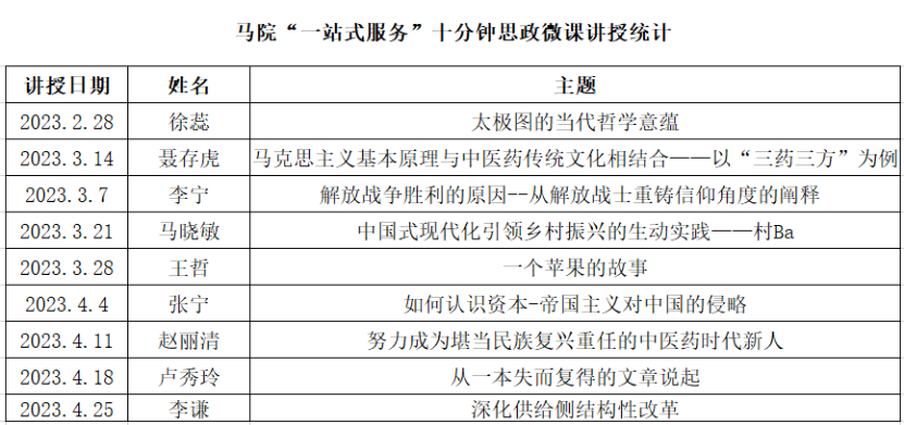 学校“一站式”学生社区综合管理服务中心是近距离服务学生、走近学生的有益探索,受到广大学生的欢迎和好评。马克思主义学院秉持“学生在哪里、思政课就讲到哪里”的原则,将思政课开到“一站式”服务中心,选聘优秀思政课教师开展“十分钟思政微课堂”系列活动。