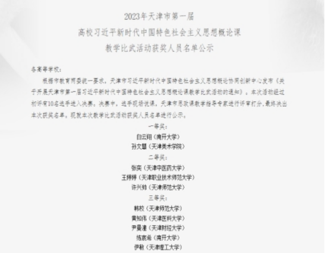 9月19日,天津市习近平新时代中国特色社会主义思想概论课协同创新中心举办2023年天津市第一届高校习近平新时代中国特色社会主义思想概论课教学比武活动,我院教师张奕经过精心准备,从预赛中脱颖而出,进入决赛。在决赛中,张奕与其他9名来自天津市各高校的思政课教师同台竞技。最终,张奕老师总成绩排名第三,荣获二等奖第一名的佳绩。