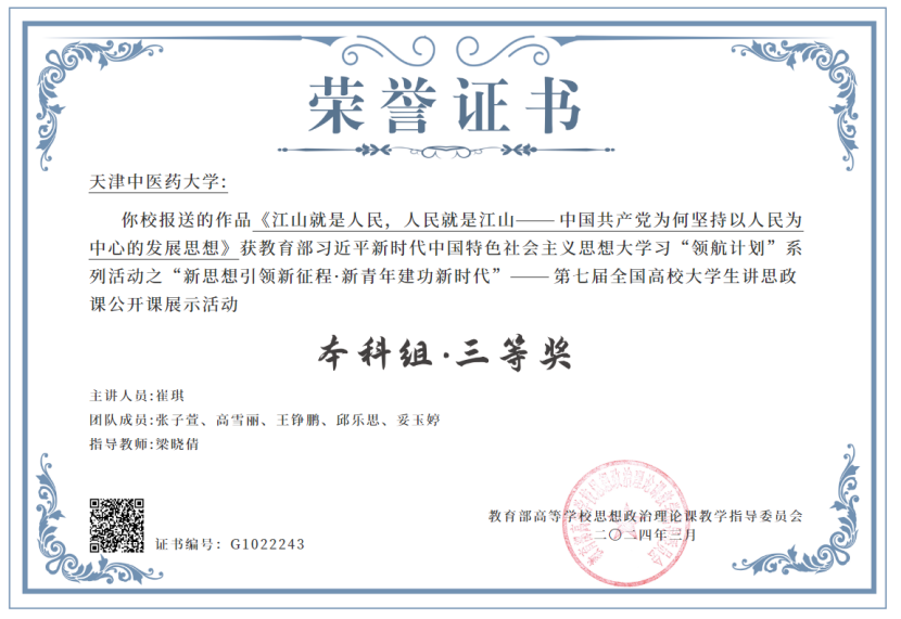 近日,由教育部高校思想政治理论课教学指导委员会主办的“新思想引领新征程·新青年建功新时代”——第七届全国高校大学生讲思政课公开课展示活动评选结果公布,由马克思主义学院教师梁晓倩指导,崔琪、张子萱、高雪丽、王铮鹏、邱乐思、妥玉婷等同学创作完成的作品《江山就是人民,人民就是江山——中国共产党为何坚持以人民为中心的发展思想》荣获本科组三等奖。