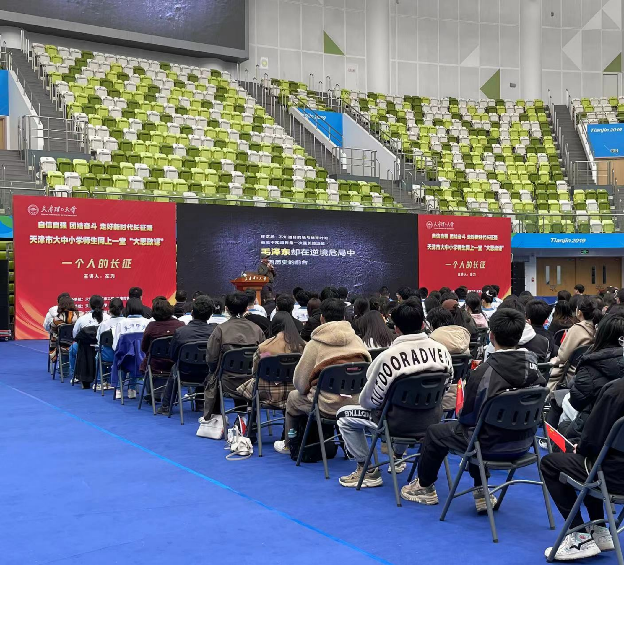 3月18日,由天津市委教育工委、天津市教委举办的天津市大中小学师生同上一堂“大思政课”——“自信自强、团结奋斗,走好新时代长征路”,在天津理工大学体育馆举行。思政大课堂邀请了中国著名摄影家、长征文化研学者、天津滨海汽车工程职业学院思政课教师左力,结合党的二十大报告和长征精神,为全市大中小学3000余师生讲了“走好新时代长征路”主题故事,通过沉浸式互动式教学引导广大师生弘扬伟大长征精神,汲取奋斗前行力量。
