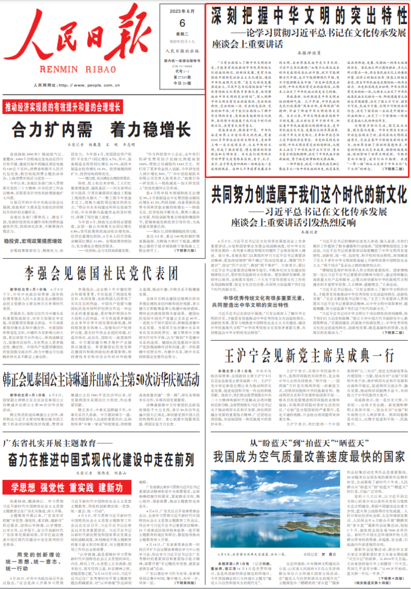 “只有全面深入了解中华文明的历史,才能更有效地推动中华优秀传统文化创造性转化、创新性发展,更有力地推进中国特色社会主义文化建设,建设中华民族现代文明。”在文化传承发展座谈会上,习近平总书记深刻指出“中华优秀传统文化有很多重要元素,共同塑造出中华文明的突出特性”,深入阐释中华文明具有突出的连续性、突出的创新性、突出的统一性、突出的包容性、突出的和平性,对于我们全面深入了解中华文明的历史,更好担负起新的文化使命,共同努力创造属于我们这个时代的新文化,具有重大指导意义。