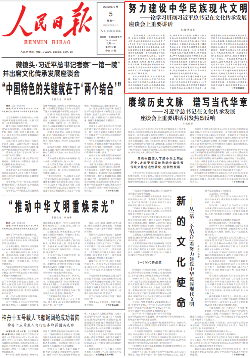 “在新的起点上继续推动文化繁荣、建设文化强国、建设中华民族现代文明,是我们在新时代新的文化使命。”6月2日,习近平总书记在北京出席文化传承发展座谈会并发表重要讲话,从党和国家事业发展全局战略高度,对中华文化传承发展的一系列重大理论和现实问题作了全面系统深入阐述。习近平总书记的重要讲话,具有很强的政治性、思想性、战略性、指导性,为坚定文化自信自强,更好担负起新时代新的文化使命,扎实推进中华民族现代文明和社会主义文化强国建设,指明了前进方向、提供了根本遵循。