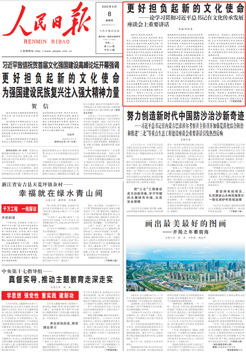 “要坚定文化自信、担当使命、奋发有为,共同努力创造属于我们这个时代的新文化,建设中华民族现代文明。”在文化传承发展座谈会上,习近平总书记深刻阐明我们在新时代新的文化使命,对努力建设中华民族现代文明提出明确要求,对于更好担负起新的文化使命,全面落实党的二十大关于宣传思想文化工作的各项战略部署,扎实推进中华民族现代文明和社会主义文化强国建设,具有重大指导意义。