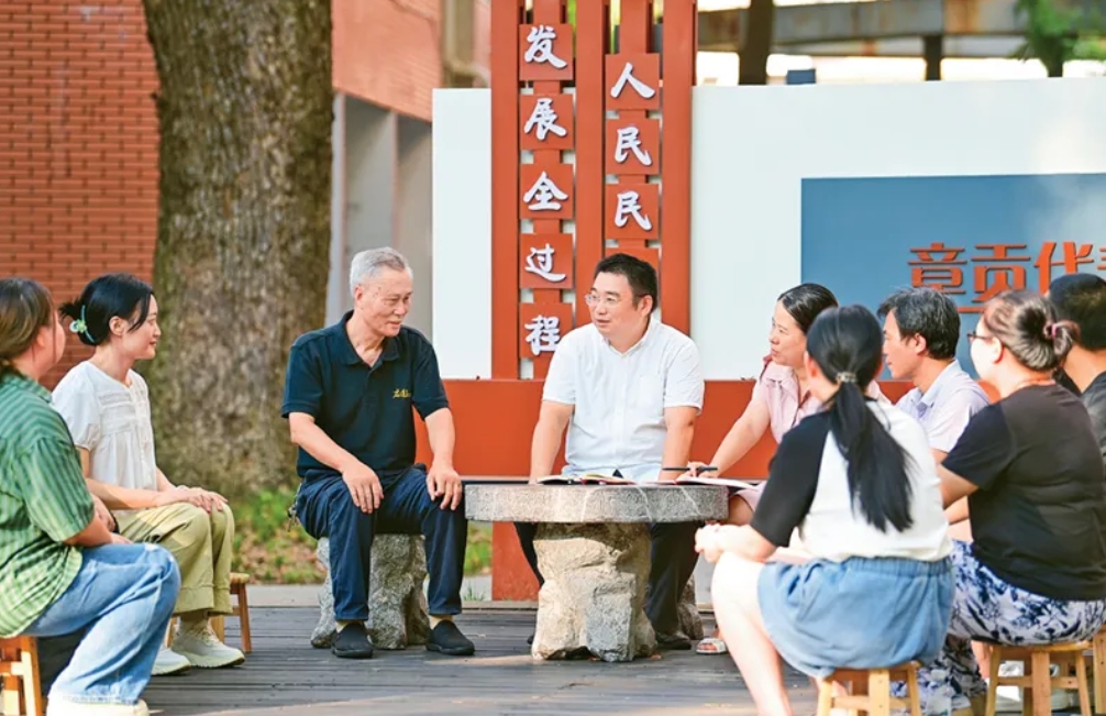 江西省赣州市章贡区高标准推进基层立法联系点建设运行,通过“开门立法”等方式,有效架起社情民意“连心桥”。图为2024年9月9日,在章贡区南外街道红环路社区,当地立法联络员同社区居民进行交流,就相关法律立法进行意见征询。 人民图片 胡江涛/摄