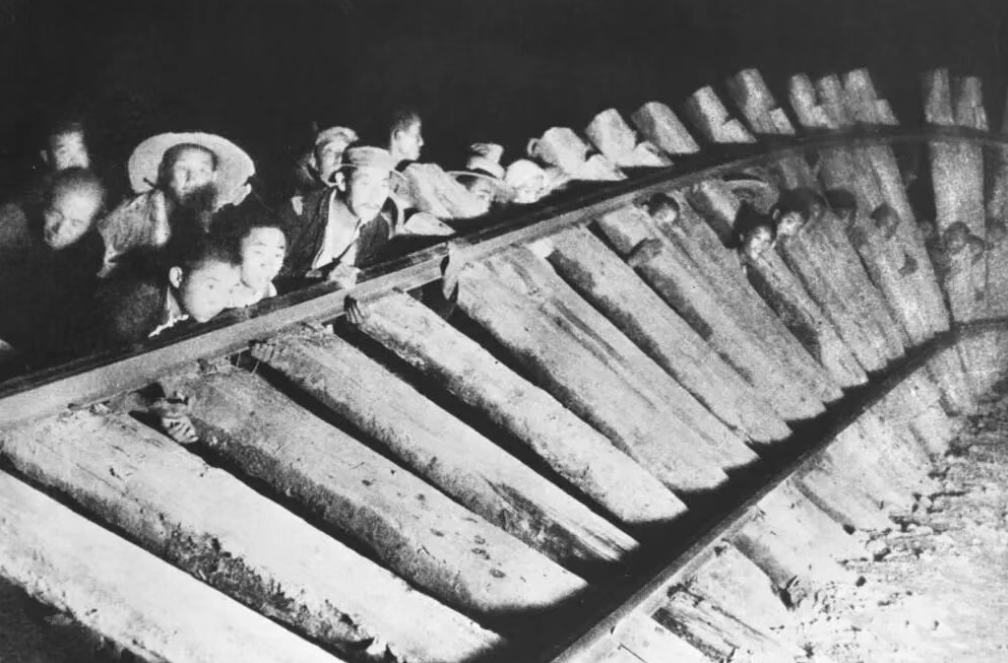中国人民抗日战争纪念馆展墙上,有一张同样是“破路”主题的照片。暗夜里,一群目光坚毅的老百姓正拼尽全力掀翻一段铁轨和连在上面的枕木,人群中还有好几个稚气未脱的娃娃。