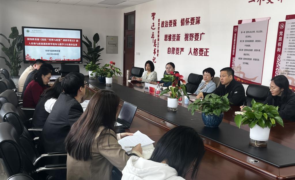 为深入学习贯彻习近平新时代中国特色社会主义思想,全面贯彻落实党的二十大和二十届二中、三中全会精神、全国教育大会精神和2025年全国两会精神,4月8日下午,形势与政策教研室围绕教育部印发的《高校“形势与政策”课教学要点》融入形势与政策课的教学视角与教学方法进行集体备课。驻校纪检监察组组长柳春敏调研指导并参加集体备课会,学院班子成员及形策教研室全体教师参加了集体备课,会议由形策教研室负责人迟歌主持。